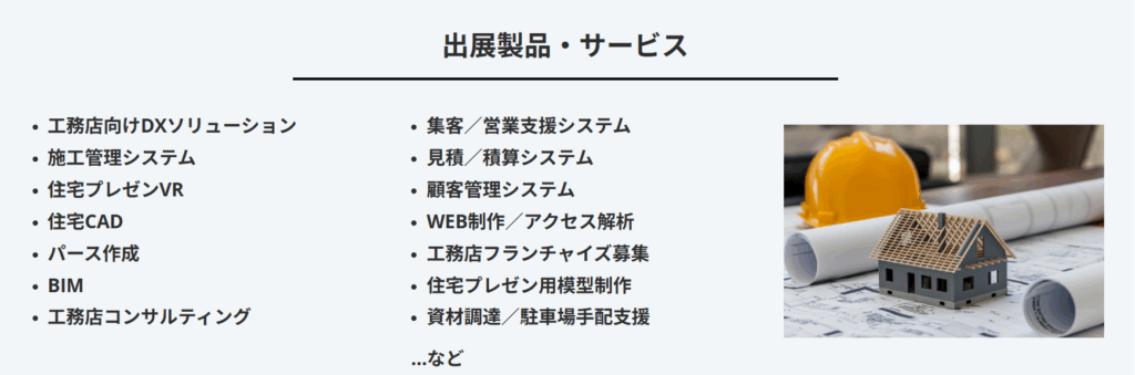 工務店向けDXソリューション、住宅CAD、業務効率化システムなどが出展。工務店、ビルダー、住宅メーカー、リフォーム会社などの専門家が来場します。